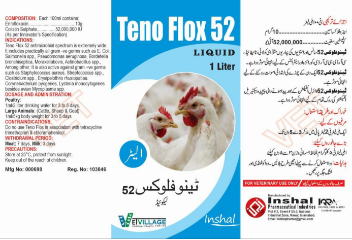 It is an advanced liquid antibiotic with an extensive antimicrobial range. Combining Enrofloxacin and Colistin Sulphate, it is highly effective against a wide array of pathogens, including gram-negative bacteria (E. coli, Salmonella, Pseudomonas aeruginosa, Bordetella bronchiseptica, Moraxella bovis, Actinobacillus species) and gram-positive bacteria (Staphylococcus aureus, Streptococcus species, Clostridium species, Erysipelothrix rhusiopathiae, Corynebacterium pyogenes, Listeria monocytogenes), as well as avian Mycoplasma. Teno Flox 52 is ideal for treating respiratory and gastrointestinal infections in poultry and livestock, along with post-viral bacterial infections.